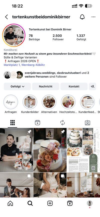 Schon damals stieg die Nachfrage nach Hochzeitstorten – Ende 2021 gründete ich deshalb mein Kleingewerbe „Tortenkunst bei Dominik Birner“. Mittlerweile bin ich seit über fünf Jahren im Hochzeitsgeschäft tätig und freue mich bereits über die ersten Buchungen für 2027.